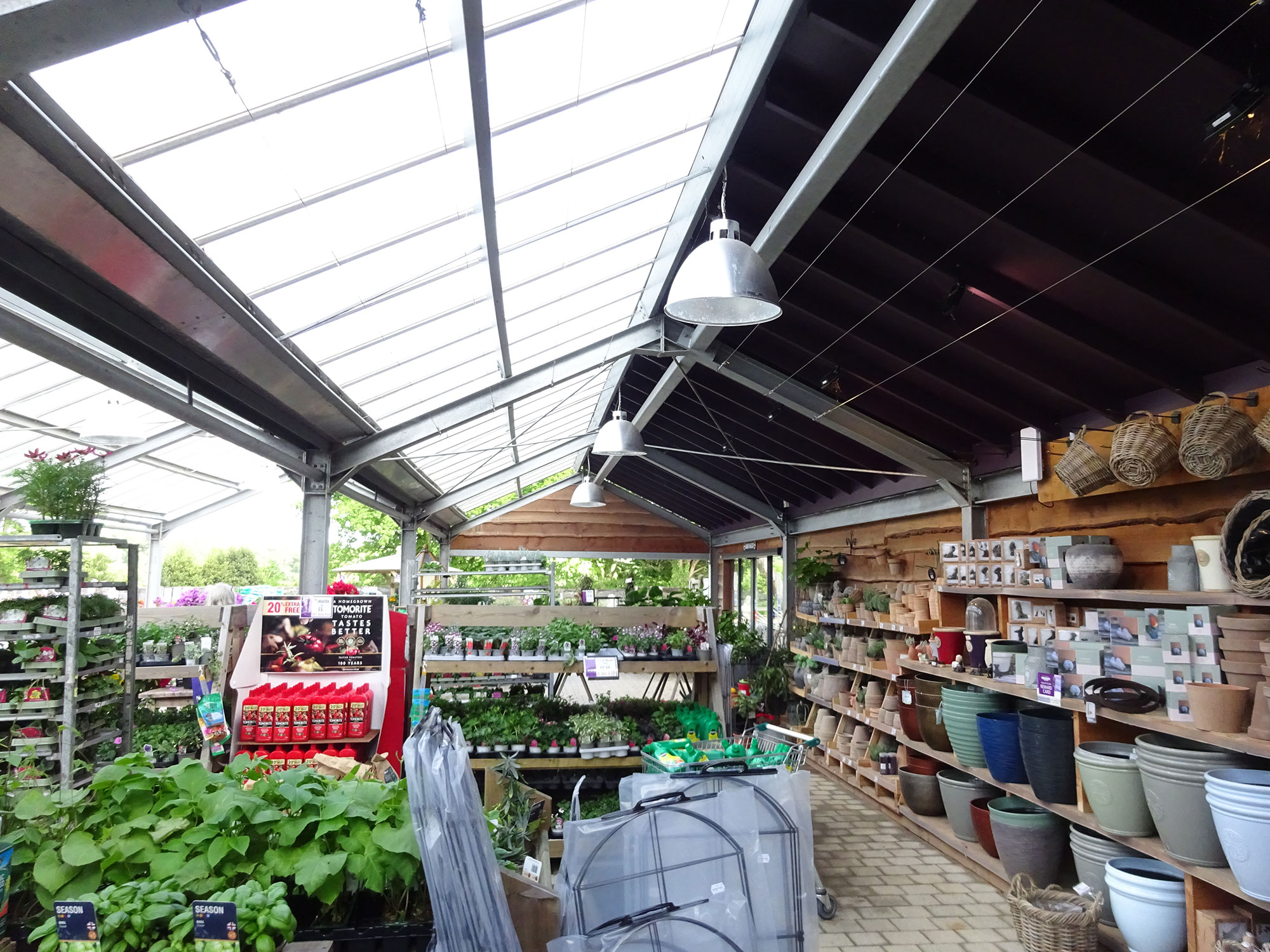 The project included creating a new site entrance improving customer flow. Addition of a restaurant and kitchen converted from an adjacent former bank building. Further covered plant protection canopies were installed as part of the courtyard sales area remodelling.